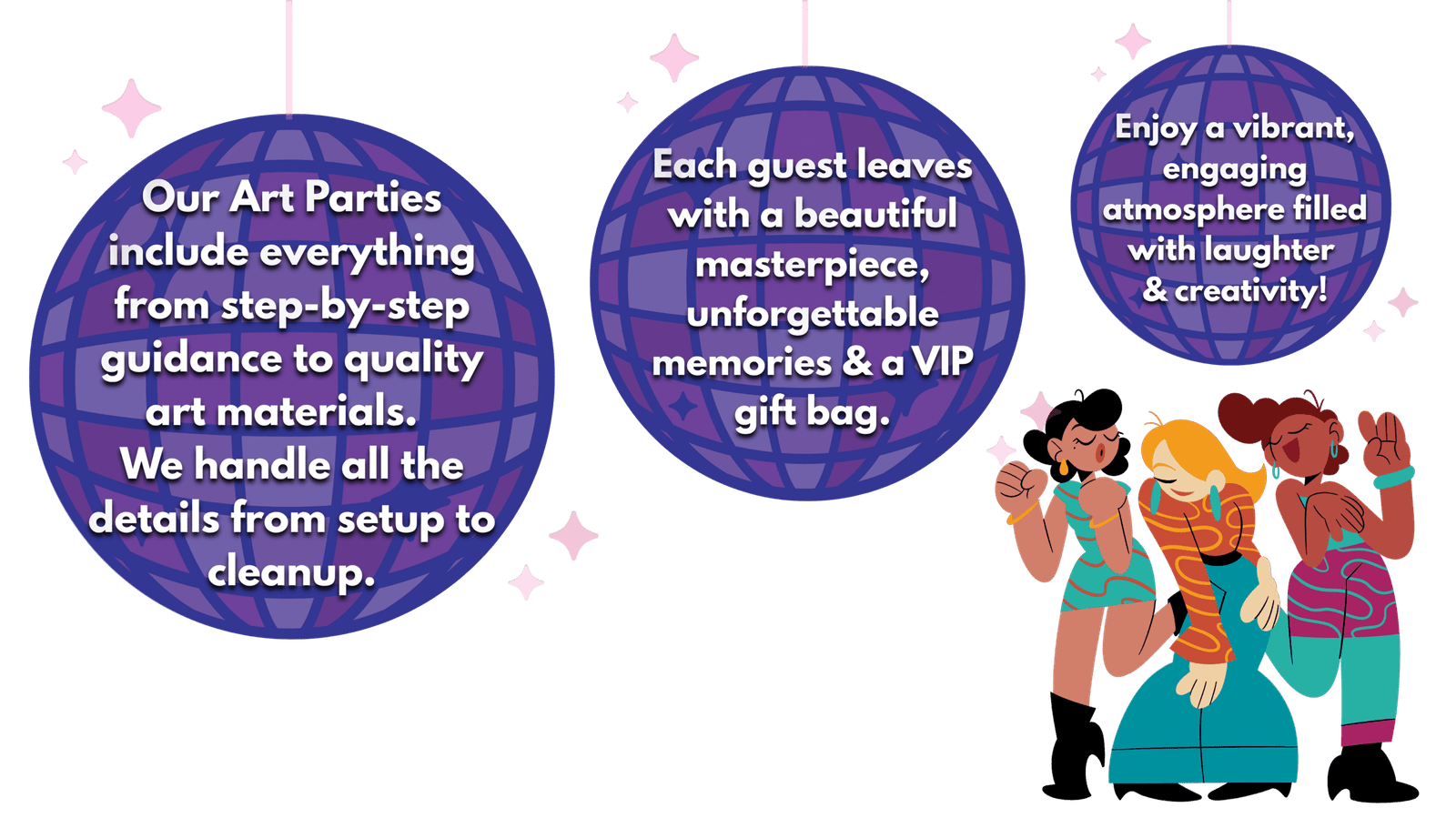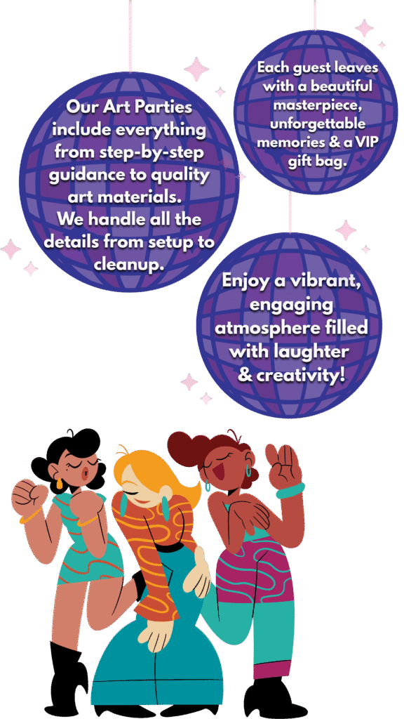 All ages! Little artists under 4 are welcome with a participating adult. Teens and adults love our parties too.